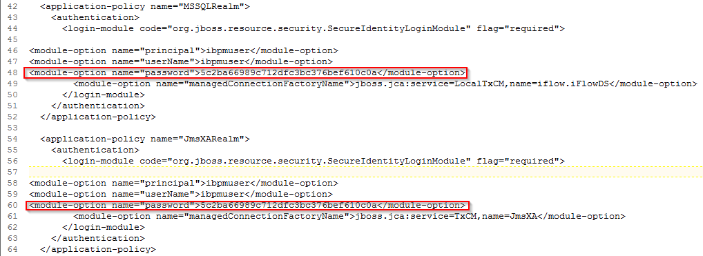 Step 2: Obtain the encrypted password in step 1 and update it to login-config.xml, typically found in {JBoss Install Root}\jboss-as\server\ibpm\conf\login-config.xml